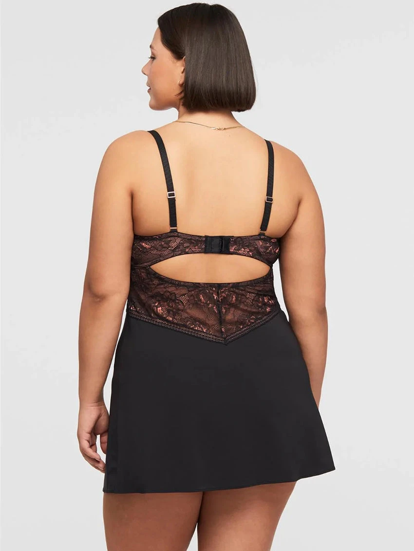 Feel enchanting in this vintage inspired lace and microfiber babydoll from Montelle. The Enchanted collection is overflowing with sultry dark romance, vintage vibes, and sensual details while maintaining Montelle’s signature comfort and support. This piece has wired cups with power mesh lining for the best support for a fuller bust, a flattering A-line skirt of soft microfiber, and a matching g-string style panty.