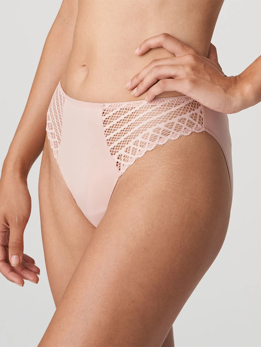 Stylish Rio briefs in a plain opaque fabric, adorned with geometric lace. The higher cut of these Rio briefs creates an elegant silhouette. The Powder Rose hue looks incredible under light summer outfits.